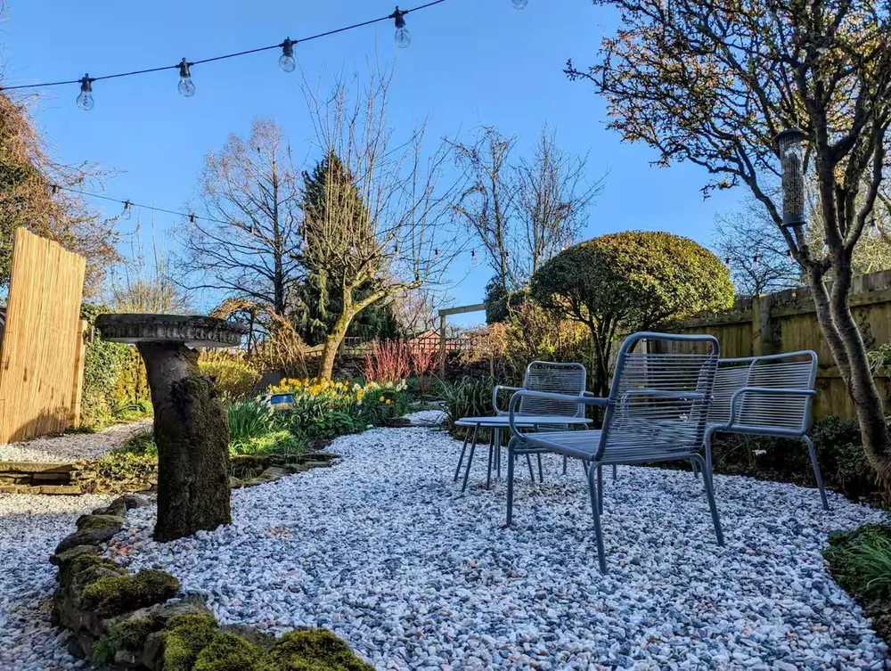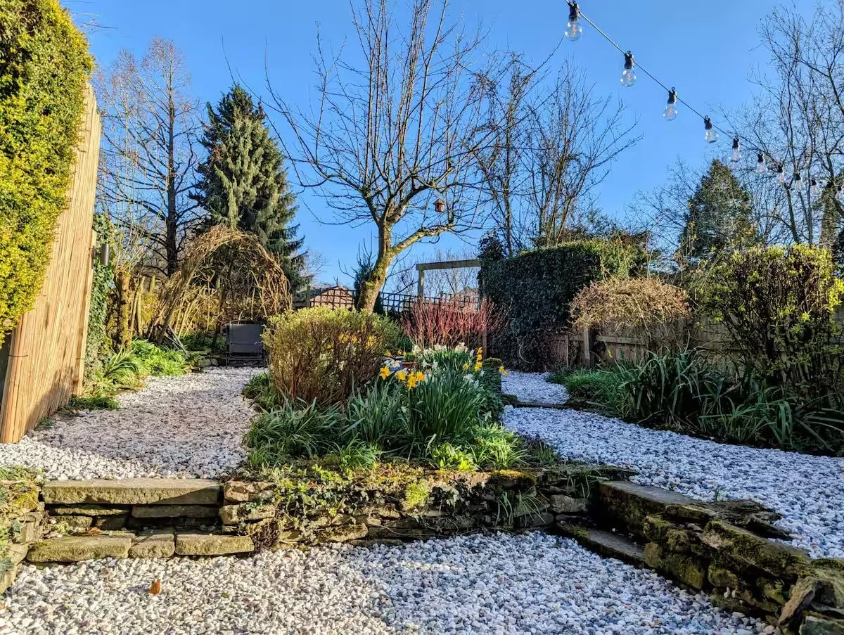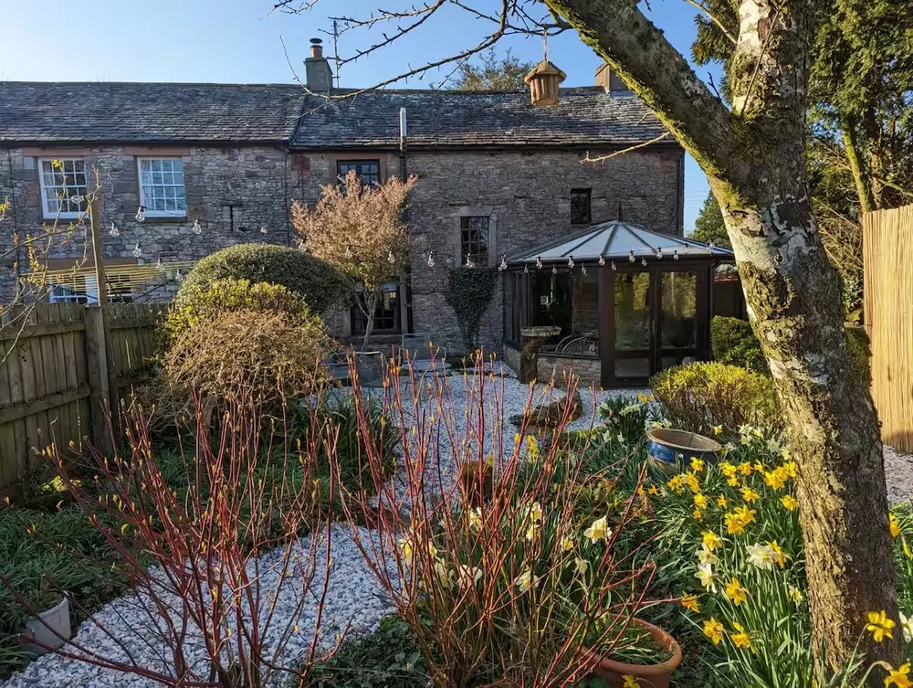 Step from the conservatory into a quiet, pretty cottage garden. Atmospheric even in winter.
