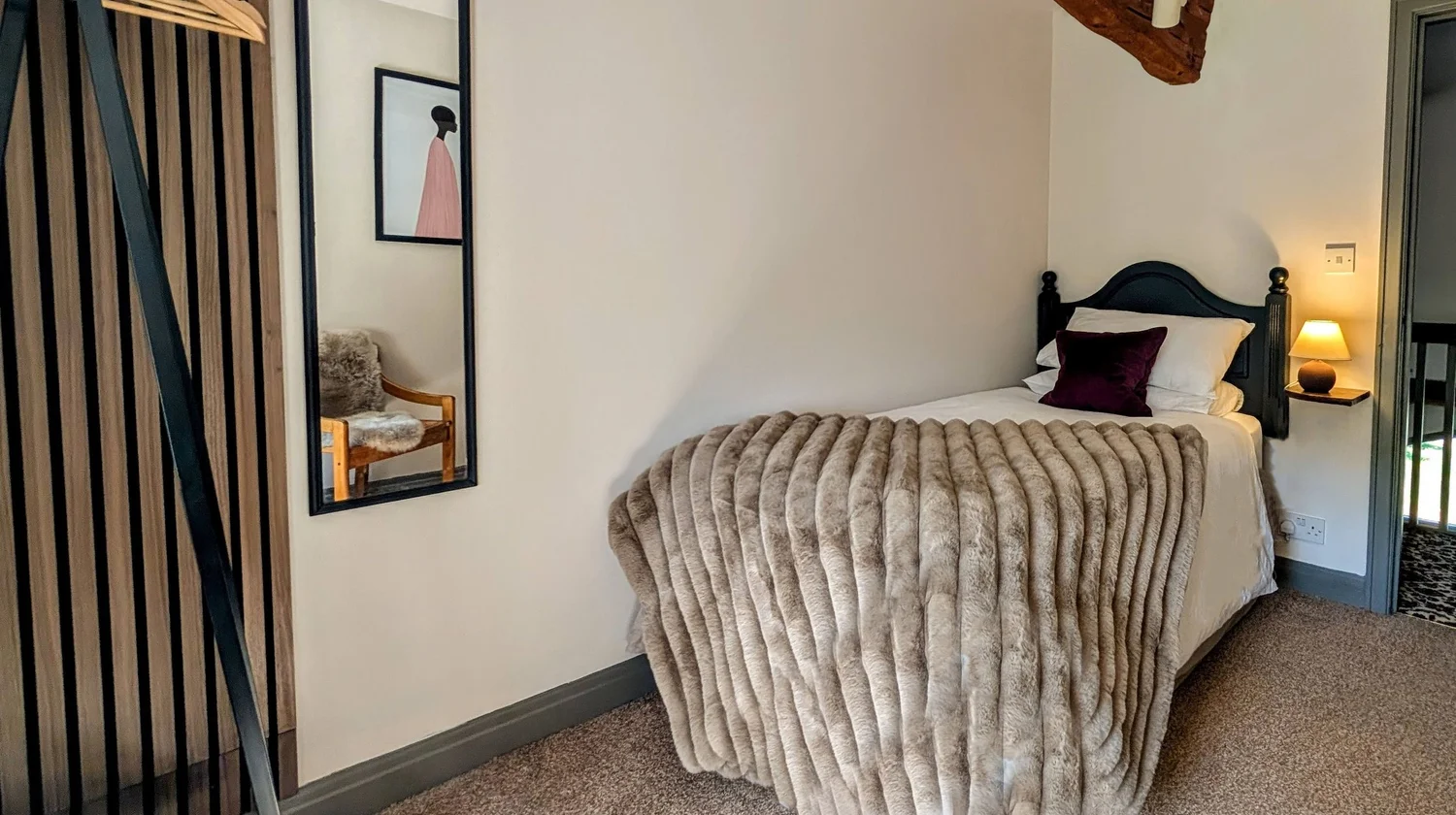 Bedroom three is cosy and gorgeously decorated with a single bed, hanging rail and chair.